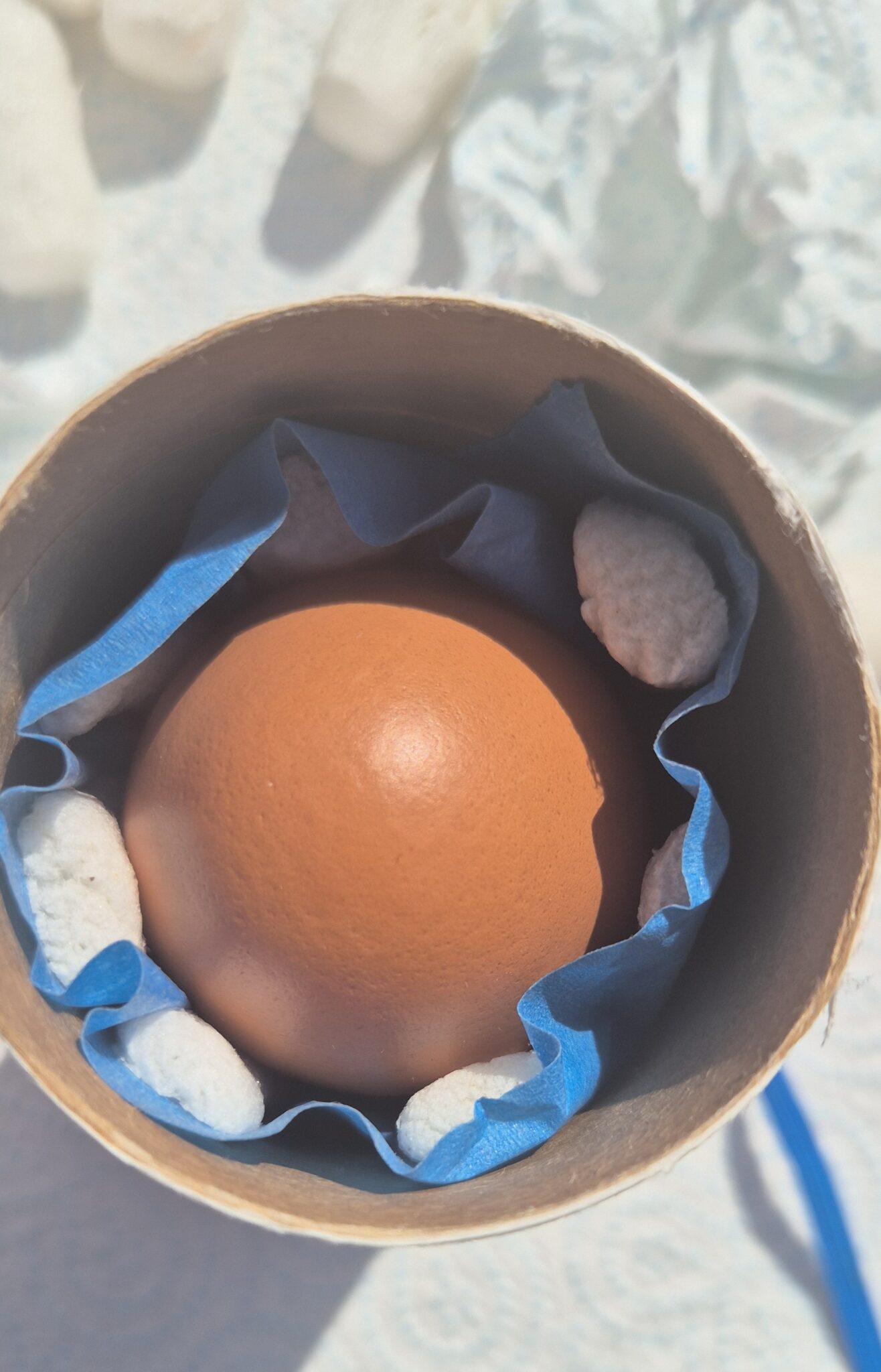 We were able to retrieve the payload bay and egg. Predictably, there was little left intact of the egg when we retrieved it; the shell had shattered entirely from the impact with the ground, and the egg yolk and white had coated the starch-based packing peanuts and the altimeters. We estimate that the payload bay hit the ground at 68 ms-1.
