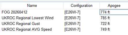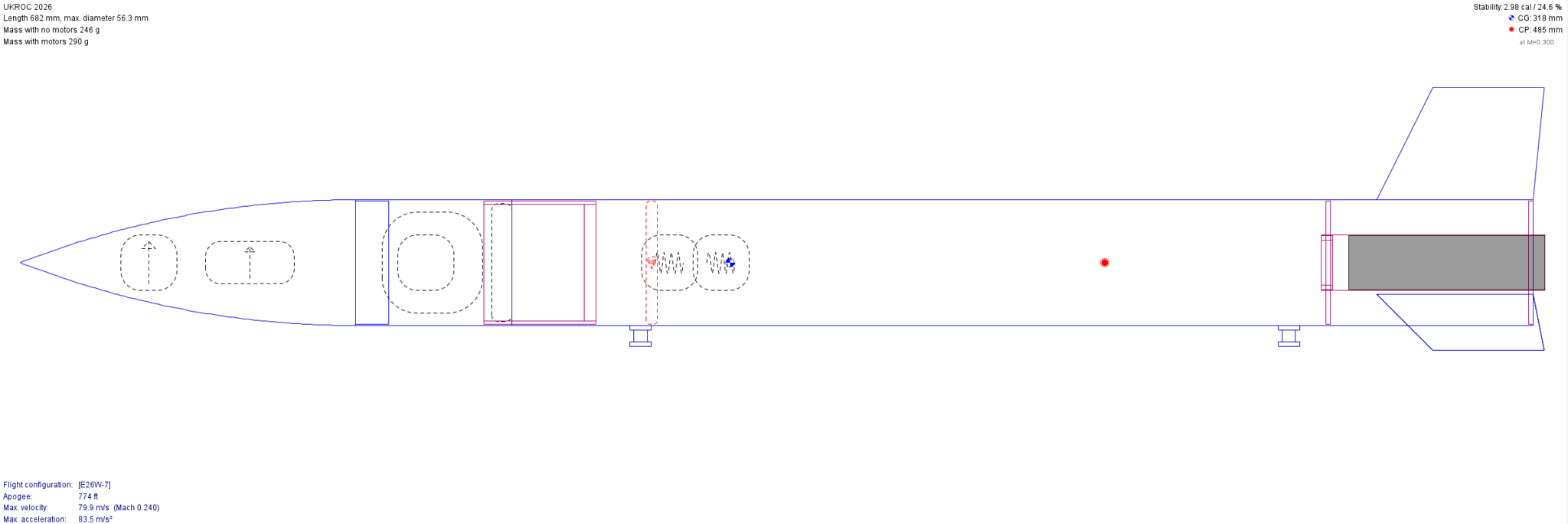 I addressed the minimum length and diameter by setting the rocket to be those dimensions. The payload mass impacted the stability of the rocket stability significantly, depending on where along the body the egg was positioned. The best position was in a dedicated payload bay just below the nose cone, so that the centre of gravity was as far above the centre of pressure as possible, to improve the stability of the rocket (NASA, 2023). The maximum mass was less of a constraint that I was concerned about, as I was prioritising a low mass. For my motor impulse, I found that the restriction would not be an issue, as the impulse I needed was much lower. Instead, I tested a motor which I already had stock of (an E26-7W motor), and it was coincidentally able to get the basic design relatively close to the targets, with some headroom above the target altitude to allow for adjustment over time.